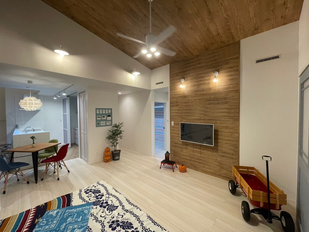 ・シーリングファンライトで勾配天井でも快適で明るいリビング